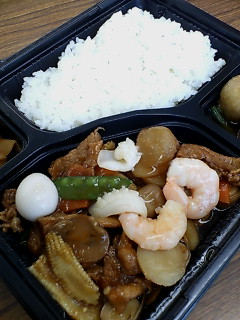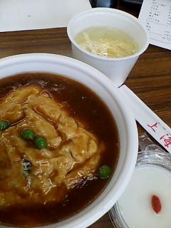 茹でた鶏肉を具にした玉子焼きのような不思議なものがあったので、これを選んでみて、あとはメンチカツとおでんの大根にちくわ。
