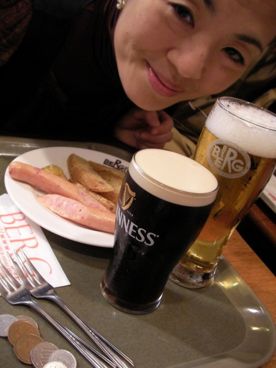 カミさんはやっぱりビール、私はギネスのハーフパイント、そしてポテト&ソーセージの皿を注文すると、1200円弱。