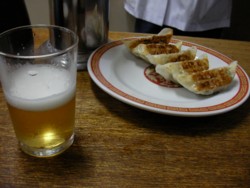 入ると、長細いテーブルの奥に通されて、ビールを頼んだのも束の間、まず焼き餃子5個が乗っかったお皿が登場。
